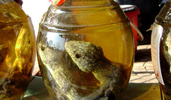 For this potent beverage found in China, lizards—traditionally the gecko—marinate in rice wine or whiskey for up to a year. According to (questionable) lore, the amber-hued drink can cure a range of ailments from ulcers to arthritis.